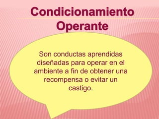 Este documento resume conceptos clave del conductismo como conductas aprendidas, respuesta operante, consecuencias, reforzadores, B.F. Skinner y los tipos de estímulos como reforzadores positivos y negativos que influyen en el aprendizaje y modificación de la conducta.