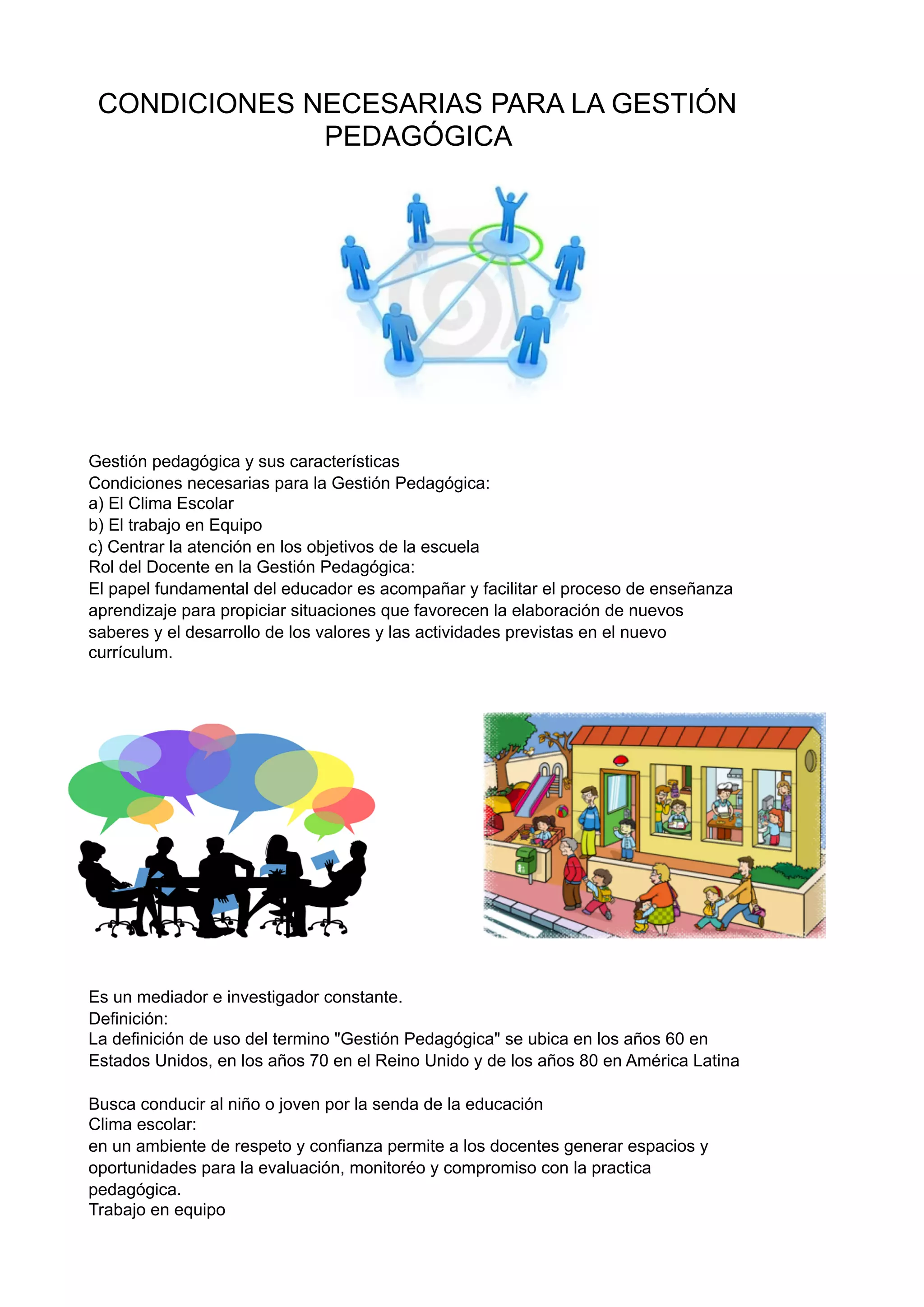 El documento describe las condiciones necesarias para la gestión pedagógica, incluyendo un clima escolar positivo, trabajo en equipo y enfocarse en los objetivos de la escuela. También discute el rol fundamental del docente como mediador e investigador en el proceso de enseñanza-aprendizaje. Finalmente, explica que la gestión pedagógica busca guiar a los estudiantes a través de la educación y requiere la implementación de prácticas docentes orientadas a los objetivos de aprendizaje.