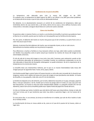 La temperatura óptima para criar la mosca del vinagre es entre 20-28°C. Aunque no es esencial controlar la temperatura estrictamente, las moscas se desarrollan mejor entre 25-28°C. La mosca del vinagre pasa por cuatro etapas de desarrollo: huevo, larva, pupa y adulto. Las hembras ponen hasta 1000 huevos durante su corta vida de 2 semanas.