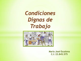 Este documento establece varias condiciones dignas de trabajo que deben cumplir los empleadores, incluyendo proveer un lugar de trabajo seguro y digno, permitir acuerdos laborales libres, prohibir dormir y comer en el lugar de trabajo, proveer vivienda y transporte a los trabajadores en ciertas circunstancias, establecer centros educativos y de salud para los trabajadores y sus familias, otorgar becas educativas, y prohibir el acoso laboral y sexual, con obligaciones para prevenir, investigar y sancionar