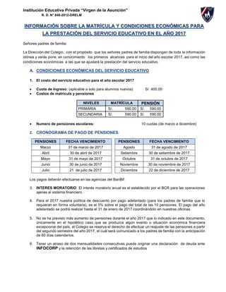 El documento detalla las condiciones económicas y el proceso de matrícula para la institución educativa privada 'Virgen de la Asunción' para el año escolar 2017. Se especifican costos de cuotas, el cronograma de pago, requisitos de matrícula y condiciones académicas, incluyendo fechas importantes y la política de descuentos. El inicio de clases está programado para el 1 de marzo de 2017.