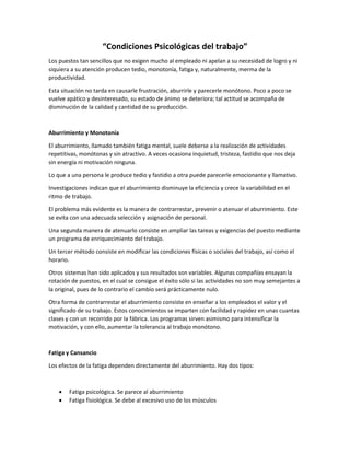 Los documentos describen varios obstáculos psicológicos en el trabajo como el aburrimiento, la fatiga y la monotonía, y proponen técnicas para combatirlos como dar autonomía a los empleados, mejorar la comunicación, fomentar la creatividad y ofrecer capacitación. También discuten cómo factores como la iluminación, el ruido y la temperatura pueden afectar el rendimiento y proponen alternativas como la motivación, rotación de tareas e intervalos de descanso.