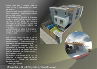 El documento presenta los planos y especificaciones de dos viviendas en un condominio ubicado en la Urb. Los Geranios en Piura. Cada vivienda tiene tres niveles con sala, comedor, cocina, baños y tres dormitorios. El proyecto incluye acabados de calidad, estacionamiento, sistema de seguridad y áreas comunes. El constructor es Monte Sol / G y J Proyectos y Construcción.
