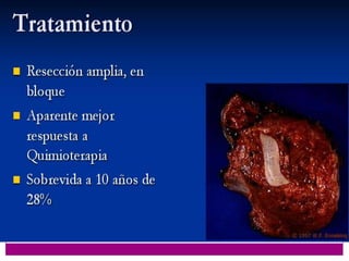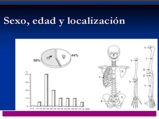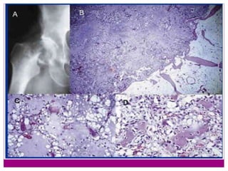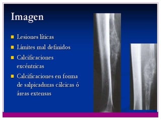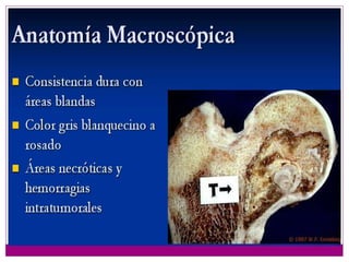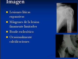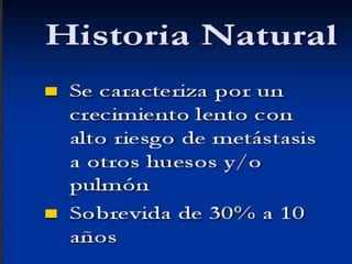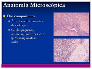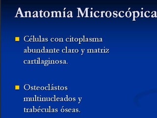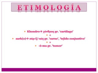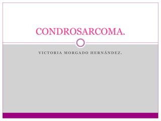 El condrosarcoma es un cáncer maligno de hueso que afecta principalmente a las células productoras de cartílago. Puede presentarse como tumor primario o secundario a lesiones preexistentes benignas. Existen varios subtipos histológicos. El tratamiento consiste en resección quirúrgica amplia, aunque la tasa de recurrencia es alta y el pronóstico depende del grado histológico.