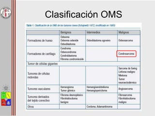 El condrosarcoma es el segundo tumor óseo maligno más común, con una incidencia de 1 en 200.000 personas por año. Suele presentarse con dolor óseo y masa palpable. El diagnóstico y tratamiento son difíciles debido a su amplia variedad de manifestaciones. Los condrosarcomas primarios son más comunes que los secundarios y pueden ser enostóicos o exostóicos. El tratamiento principal es la resección quirúrgica del segmento óseo afectado, pero la tasa de recidiva es alta con cirugía conserv