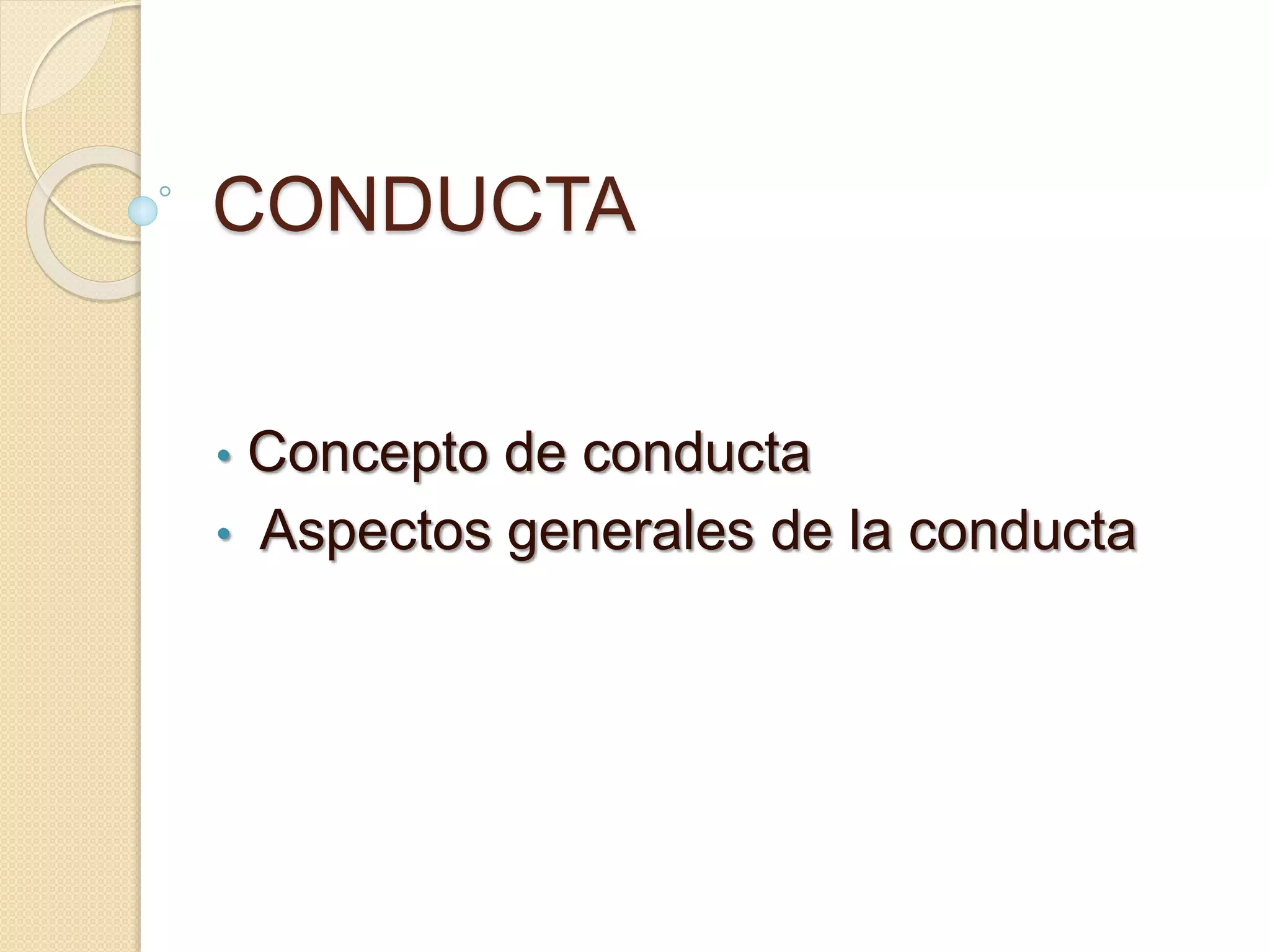 La conducta se refiere al conjunto de actos y comportamientos externos de un ser humano que pueden ser observados por otros. Algunos aspectos generales de la conducta incluyen la topografía, cantidad, latencia e intensidad.