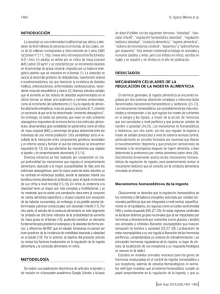 Este documento revisa los factores involucrados en la regulación de la ingesta alimentaria y la conducta alimentaria en niños. Explica que la ingesta se regula a través de mecanismos homeostáticos y hedónicos. Los mecanismos homeostáticos involucran hormonas que regulan los niveles de nutrientes en la sangre, mientras que los mecanismos hedónicos involucran el sistema de recompensa cerebral y neurotransmisores como la dopamina. Estudiar la conducta alimentaria en niños puede ayudar a predec