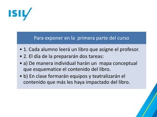 Los estudiantes leerán un libro asignado por el profesor. Individualmente crearán un mapa conceptual del contenido del libro. Luego trabajarán en equipos para teatralizar la parte del contenido que más les haya impactado.