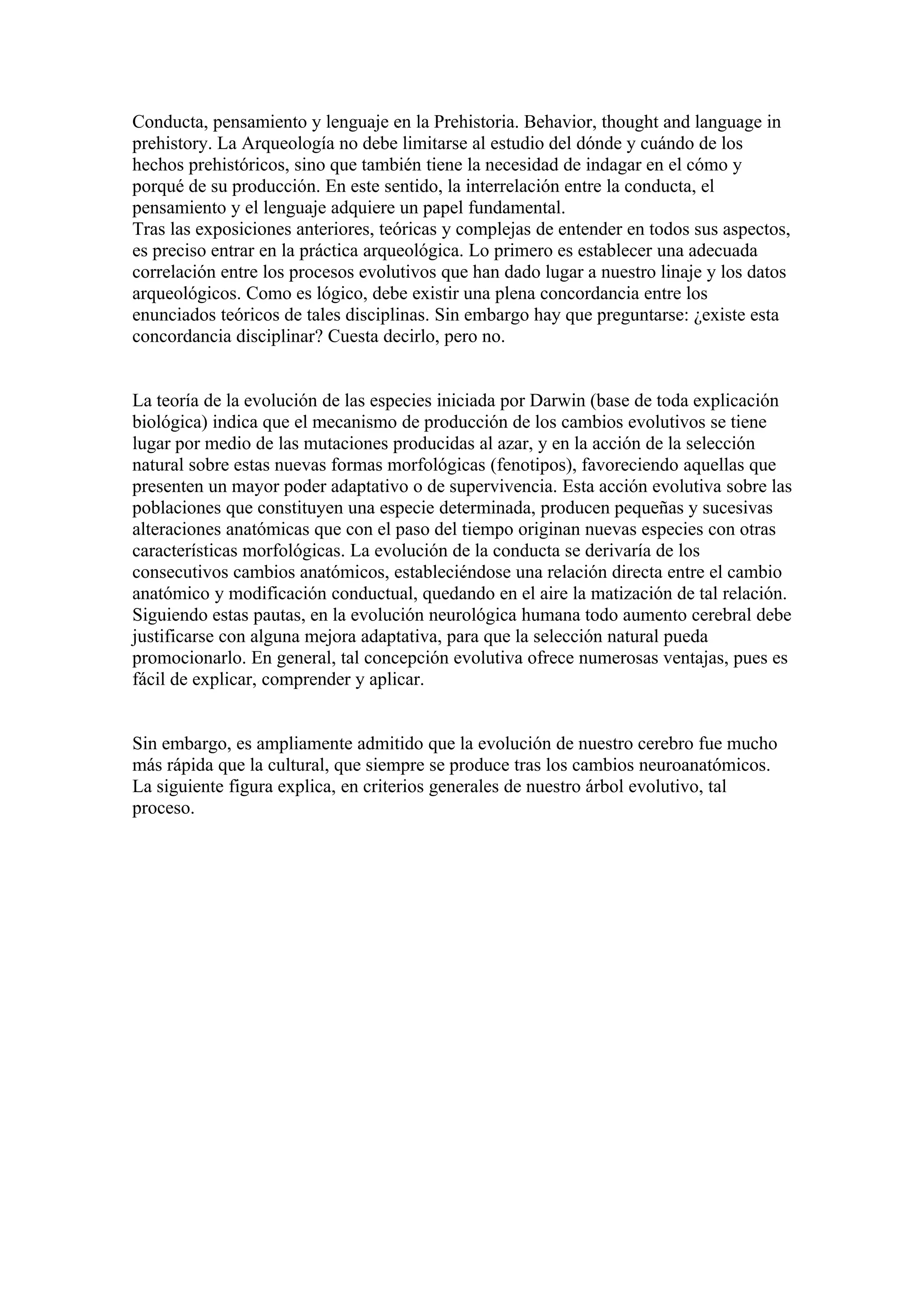 El documento discute la evolución del comportamiento, el pensamiento y el lenguaje en la prehistoria. Explica que la evolución neurológica humana ocurrió antes que los avances culturales y conductuales, los cuales emergieron a través de procesos cognitivos como la exaptación. También señala que el desarrollo de la conducta simbólica requirió de capacidades cognitivas evolutivas y un acervo cultural previo que actuó como estímulo.