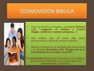 1) El documento discute las cosmovisiones conductista y bíblica sobre el origen de la conducta humana. 2) Mientras que la cosmovisión bíblica postula que la conducta es el resultado del pensamiento y la voluntad dado que el hombre fue creado a imagen de Dios, el conductismo postula que la conducta es determinada completamente por estímulos ambientales. 3) El documento también resume las influencias del positivismo, evolucionismo y experimentos de Pavlov sobre el desarrollo del conductismo.