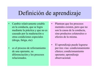 La teoría conductista sostiene que el comportamiento humano está determinado por la interacción entre la herencia genética y el ambiente. El aprendizaje ocurre a través del condicionamiento clásico, el condicionamiento operante y la observación, y se define como un cambio estable en la conducta logrado mediante la práctica. El condicionamiento operante de Skinner describe cómo los refuerzos positivos y negativos, así como los castigos, pueden modificar la probabilidad de que ocurra un comportamiento.