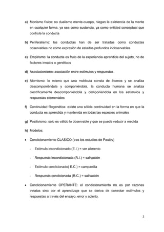 El documento describe los orígenes y principios fundamentales de la corriente conductista en psicología. El conductismo surge a principios del siglo XX para estudiar el comportamiento de forma estrictamente experimental y observable, considerando la relación estímulo-respuesta. John Watson propuso este enfoque para que la psicología sea una ciencia objetiva que se centre en la conducta en lugar de los estados mentales. El conductismo tuvo gran influencia al promover el uso del método científico experimental en psicología.