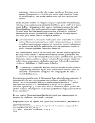 El conductismo se originó con los trabajos de John Watson y fue desarrollado por B.F. Skinner, quienes argumentaron que la conducta humana está determinada por el condicionamiento y el ambiente más que por procesos mentales. El conductismo ve al ser humano como una máquina biológica que responde a estímulos y busca predecir y controlar la conducta a través de recompensas y castigos. Esta visión reduce al ser humano y niega su libertad, responsabilidad y dignidad, en conflicto con una perspectiva bíblic