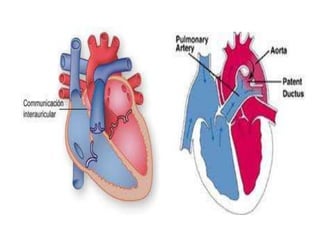El documento describe la tetralogía de Fallot, una cardiopatía congénita caracterizada por cuatro anomalías: comunicación interventricular, estenosis de la arteria pulmonar, dextroposición de la aorta y hipertrofia ventricular derecha. Provoca cianosis y crisis hipóxicas. Su diagnóstico se realiza mediante ecocardiografía y su tratamiento es quirúrgico.