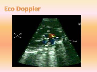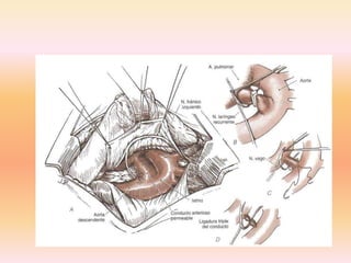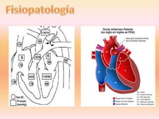 Este documento describe el conducto arterioso persistente, una afección congénita que causa una comunicación anormal entre la arteria pulmonar y la aorta. Afecta a aproximadamente 1 de cada 2,000 recién nacidos y es más común en mujeres. Sin tratamiento, puede causar insuficiencia cardíaca y otros problemas de salud graves. El tratamiento incluye el uso de indometacina para cerrar quirúrgicamente el conducto o dispositivos de oclusión como coils y amplatzers que se colocan mediante cateterismo.