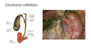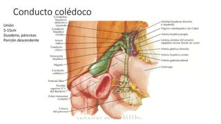 El conducto colédoco une el hígado y el páncreas al duodeno. Mide entre 5-15 cm y drena la bilis y los jugos pancreáticos a través de la ampolla de Vater y la papila duodenal mayor al intestino delgado. Recibe irrigación sanguínea de la arteria cística y drena venosamente al hígado a través de la vena porta hepática, mientras que el drenaje linfático ocurre a través de los ganglios císticos, hepáticos y celíacos