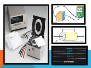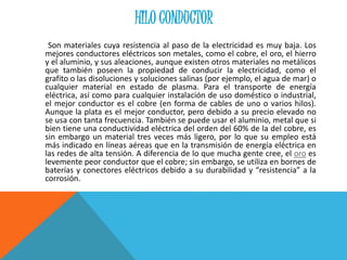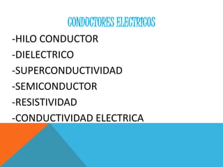 Este documento describe los diferentes tipos de conductores eléctricos, incluyendo hilos conductores como el cobre y la plata, dieléctricos que sirven como aislantes, superconductores que conducen electricidad sin resistencia, semiconductores cuyas propiedades dependen de factores externos, y conceptos como resistividad y conductividad eléctrica.