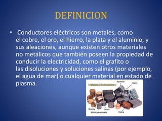Este documento clasifica y describe los conductores eléctricos. Se clasifican según su constitución (alambre o cable), número de conductores (monoconductor o multiconductor), voltaje (alta, media o baja tensión), y utilización. Los conductores están formados por un alma conductora, aislamiento y cubierta protectora. Se identifican por colores y su ampacidad define la corriente máxima que pueden transportar sin sobrepasar su temperatura nominal.