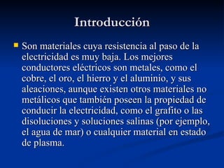 Este documento describe las características de los conductores, aislantes y semiconductores. Explica que los metales son buenos conductores debido a que sus electrones pueden moverse libremente. También describe las propiedades de los líquidos, gases y semiconductores y sus usos como conductores eléctricos. Finalmente, detalla los materiales usados comúnmente como aislantes sólidos, líquidos y gaseosos en aplicaciones como transformadores.