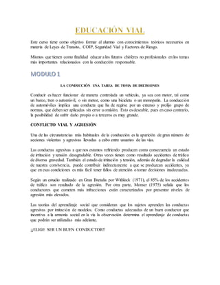 Este curso tiene como objetivo formar a los estudiantes sobre las leyes de tránsito, el Código Orgánico Integral Penal, la seguridad vial y los factores de riesgo. Cubre temas como la conducción responsable, las señales de tránsito, los tipos de accidentes y cómo evitarlos, y las normas para peatones, pasajeros y conductores. El curso enseña sobre los organismos de tránsito y las categorías de licencias, e informa sobre infracciones, delitos y sanciones relacionadas con el tráns