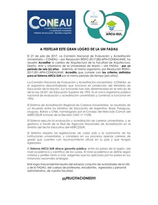 La carrera de Arquitectura de la Facultad de Arquitectura, Diseño, Arte y Urbanismo de la Universidad de Morón (UM FADAU) ha sido acreditada por seis años por la Comisión Nacional de Evaluación y Acreditación Universitaria (CONEAU) y también cumple con los criterios del Sistema ARCU-SUR por el mismo período. Este logro se debe al esfuerzo conjunto de la comunidad de la UM FADAU, incluyendo autoridades, profesores, estudiantes, egresados y personal administrativo.