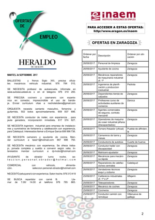 El boletín de empleo informa sobre oportunidades laborales en Aragón, incluyendo vacantes en sectores público y privado, junto con cifras de contacto y enlaces para obtener más información. Se detallan ofertas específicas para diferentes profesiones, así como datos de agencias de colocación y programas de formación disponibles. Además, se incluyen requisitos para algunas posiciones y fechas límites para la presentación de solicitudes.