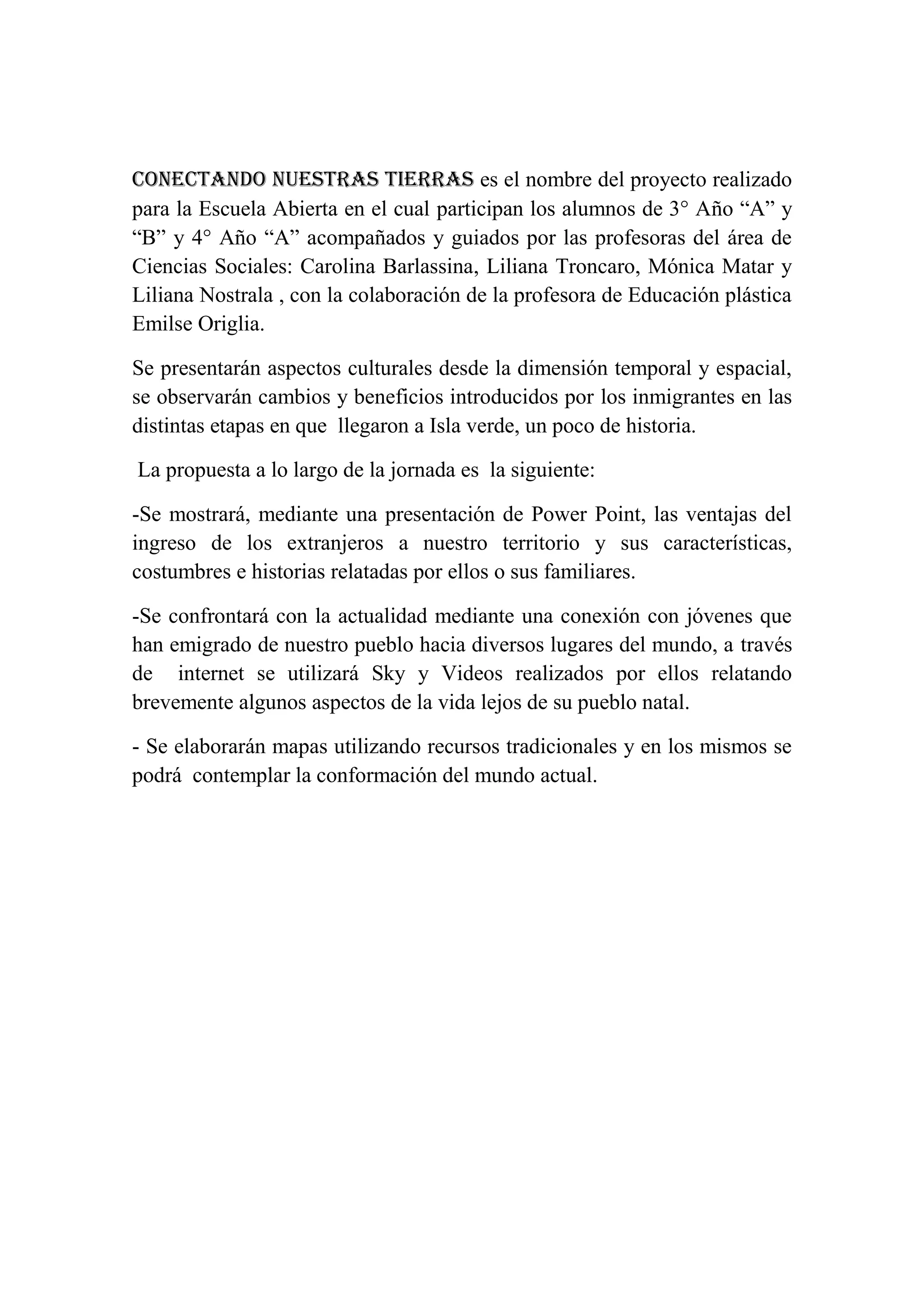 El documento describe un proyecto llamado "conectando nuestras tierras" llevado a cabo por estudiantes y profesoras de la Escuela Abierta. El proyecto presentará aspectos culturales e historia de Isla Verde y los cambios introducidos por inmigrantes a través de presentaciones de PowerPoint y videos. Los estudiantes también elaborarán mapas para mostrar la conformación actual del mundo.