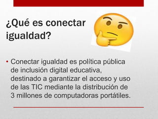 Conectar Igualdad es una política pública de inclusión digital educativa que tiene como objetivo distribuir 3 millones de computadoras portátiles a estudiantes de escuelas secundarias y terciarias estatales de todo el país. La gestión de esta política está a cargo de cuatro organismos nacionales y busca promover la calidad educativa con igualdad de oportunidades mediante el uso de las tecnologías de la información y comunicación.