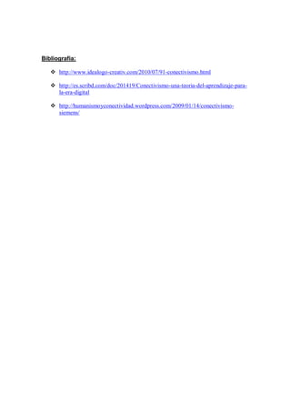 El documento describe el conectivismo, una teoría del aprendizaje propuesta por George Siemens y Stephen Downes para la era digital. Explica que las teorías tradicionales del aprendizaje ya no son adecuadas debido a que hoy en día es fundamental estar informado y conectado. El conectivismo propone que aprender involucra crear y navegar redes, lo que es una idea fascinante. Además, señala que aunque la tecnología es cada vez más importante, un buen profesor puede enseñar de manera efect