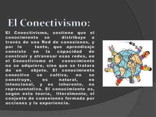 El aprendizaje se fundamenta en la diversidad de opiniones y en la capacidad de establecer conexiones entre diferentes fuentes de información. Los estudiantes deben ser proactivos, pasando de consumidores a productores del conocimiento, utilizando tecnologías y redes para construir sus propios entornos de aprendizaje. En este modelo, el rol del profesor se transforma en un facilitador que guía a los estudiantes en un proceso de aprendizaje colaborativo y auto-dirigido.