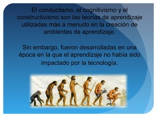 El documento introduce la teoría del conectivismo como una teoría de aprendizaje para la era digital que integra principios de caos, redes y complejidad. Explica que el aprendizaje ocurre a través de la conexión de nodos de información en ambientes cambiantes más allá del control individual. También presenta los principios del conectivismo como aprender a través de opiniones diversas, conectar fuentes de información y reconocer que el conocimiento puede residir en dispositivos no humanos.