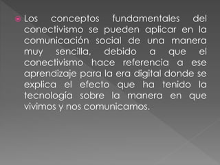El documento describe cómo los conceptos fundamentales del conectivismo, como el aprendizaje constante y la circulación de conocimientos, se pueden aplicar a la comunicación social. En la comunicación social, al igual que en el conectivismo, hay una renovación continua de la información y un ciclo de retroalimentación para mantenerse actualizado. Aplicar los principios del conectivismo de conectar diferentes fuentes de información puede facilitar la comunicación social.