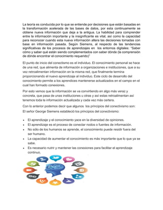 El conectivismo es una teoría del aprendizaje digital desarrollada por George Siemens y Stephen Downes que explica el aprendizaje complejo en un mundo social digital en rápida evolución. Se basa en que el aprendizaje ocurre a través de conexiones dentro de redes, con nodos y conexiones que definen el aprendizaje. El conocimiento reside fuera de los individuos y se mantiene actualizado a través del intercambio de información en redes.