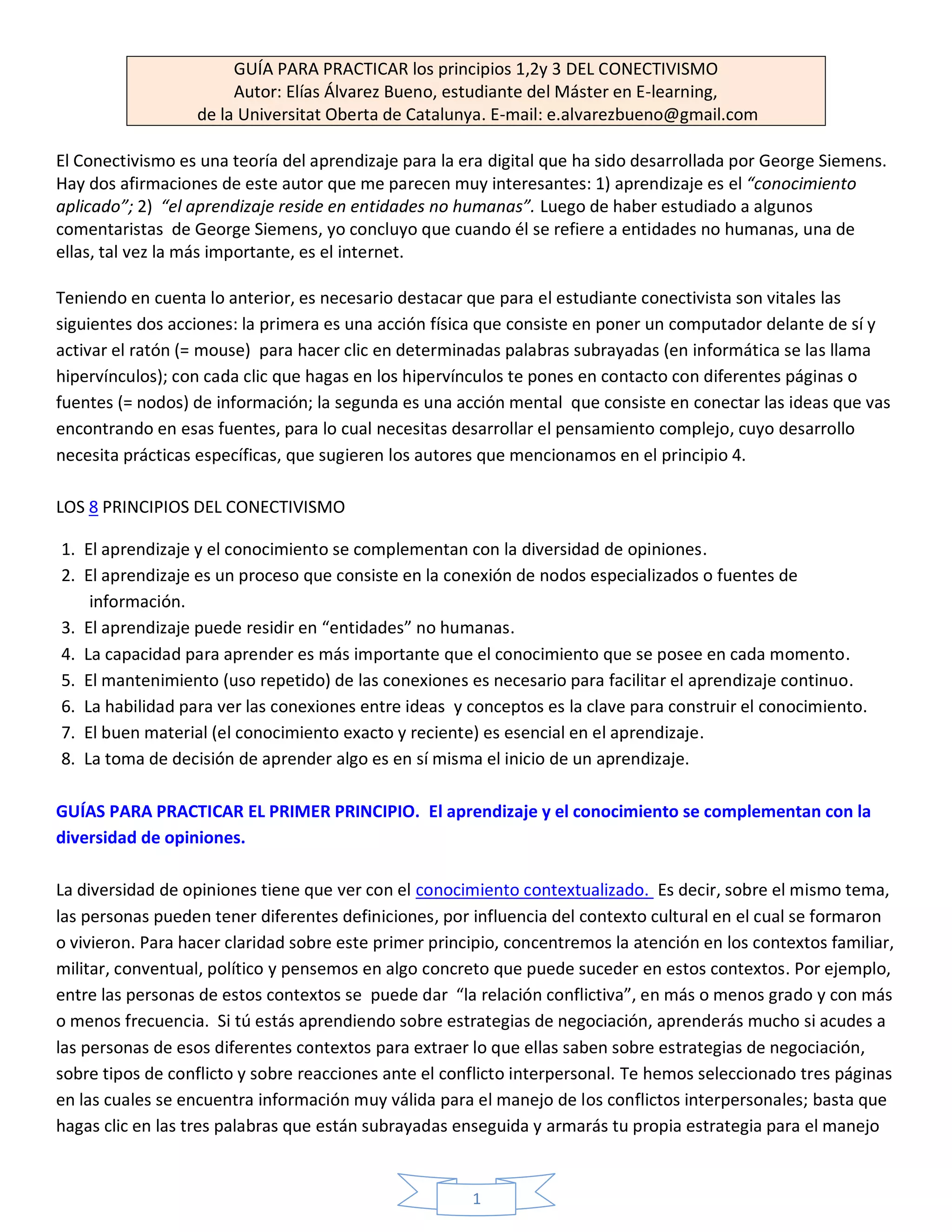 El documento presenta una guía para practicar los primeros cuatro principios del conectivismo, una teoría del aprendizaje desarrollada por George Siemens. Explica cada principio y ofrece enlaces e instrucciones para practicarlos, enfocándose en conectar nodos de información y fuentes a través de la lectura y discusión.