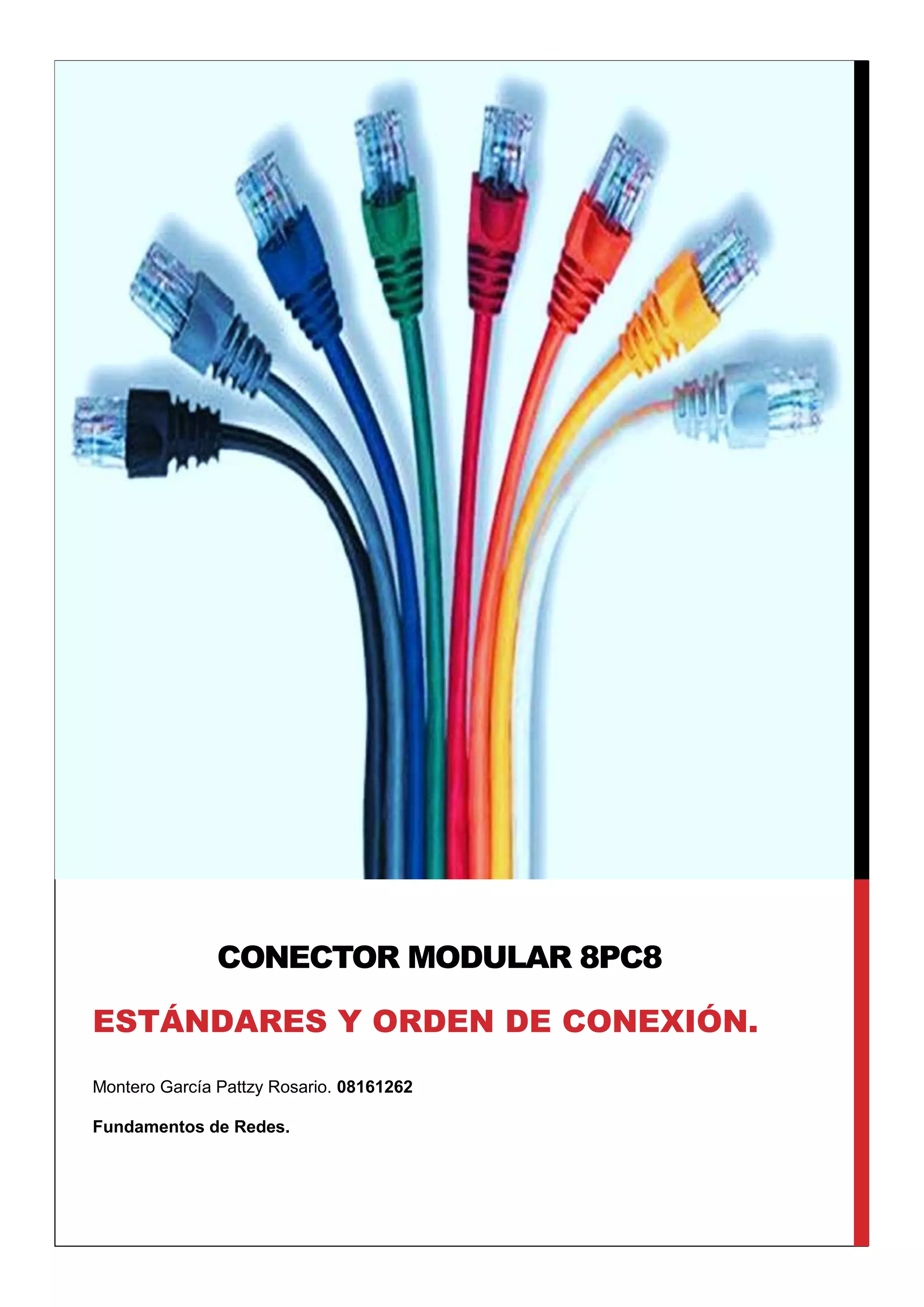 El documento describe el conector modular 8P8C (RJ45), incluyendo su aspecto físico, aplicaciones y los estándares TIA/EIA-568 que definen el orden de conexiones T568A y T568B. Estos estándares especifican la asignación de pares de conductores a los pines del conector para cables de red terminados correctamente. El orden de conexiones asegura la compatibilidad entre los extremos del cable.