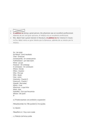El documento describe cinco conectores lingüísticos en inglés ("then", "moreover", "furthermore", "besides", "in addition to") y sus usos para dar continuidad a una idea. Además, proporciona ejemplos de cómo se utilizan estos conectores en oraciones.