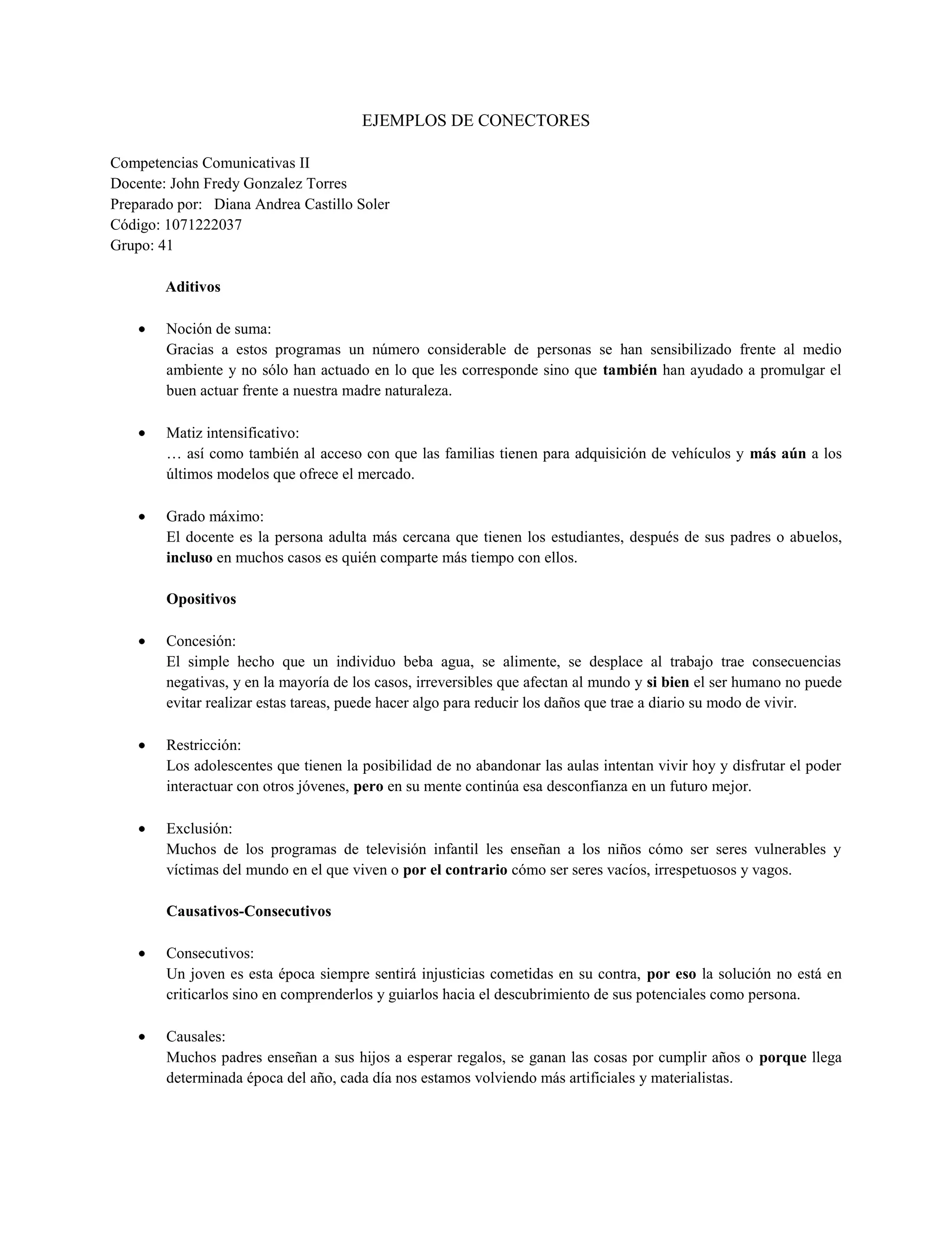 El documento presenta numerosos ejemplos de conectores que pueden utilizarse en español para unir oraciones y párrafos de manera coherente. Incluye conectores aditivos, opositivos, causativos-consecutivos, comparativos, reformulativos, ordenadores y temporales/espaciales, proporcionando definiciones y ejemplos breves de cada tipo.