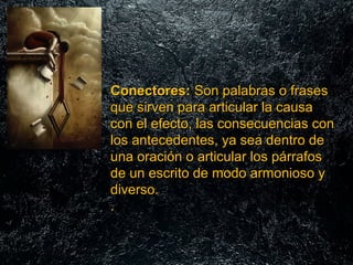 Este documento describe diferentes tipos de conectores y palabras clave que se pueden usar para articular ideas dentro de un escrito de manera coherente. Explica conectores de causa y efecto, adversativos, temporales, de orden, y de resumen, así como palabras de transición, aditivas, de énfasis, concesión, comparativas, espaciales y condicionales. El objetivo final es lograr un todo coherente en el escrito.