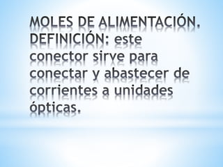 Este documento describe diferentes tipos de conectores que se encuentran en una computadora, incluyendo el conector ATX de 20/24 pines que provee corriente a la placa base, el conector PCI Express para la tarjeta gráfica, y el conector floppy cuya función principal era alimentar las disqueteras. También menciona que la mayoría de placas madres incluyen puertos como serial, paralelo, USB, LAN, VGA y audio.