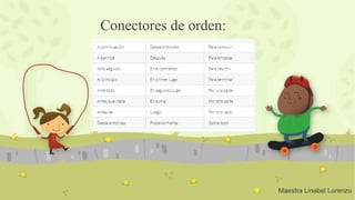 Los conectores de orden son palabras o expresiones que permiten señalar una relación entre dos oraciones o enunciados, como indicar una secuencia o sucesión de ideas.