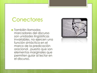 Los conectores son unidades lingüísticas que permiten guiar al lector a través del discurso, conectando las diferentes partes del texto y manteniendo la continuidad. Existen diferentes tipos de conectores que se diferencian según la unidad que conectan y la semántica que expresan, incluyendo conectores aditivos, contra argumentativos, causales y consecutivos. El uso adecuado de conectores ayuda a engarzar los fragmentos del texto y mejora el resultado final.