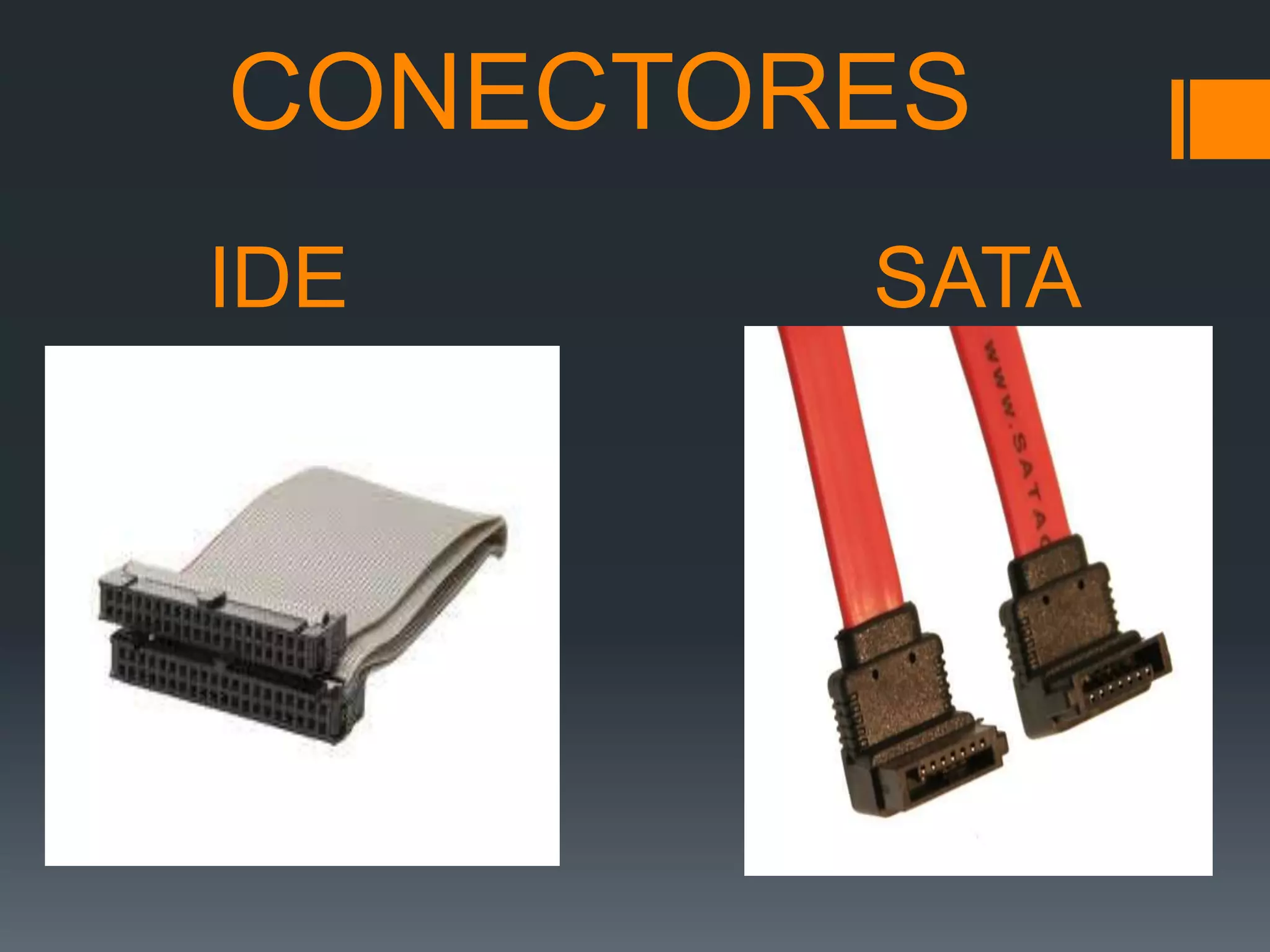 Este documento describe los conectores IDE y SATA utilizados para conectar discos duros y otros dispositivos de almacenamiento a las placas base de las computadoras. Explica las diferencias entre los conectores IDE de 40 pines y los conectores SATA más modernos de 7 pines, así como las ventajas del protocolo SATA sobre el IDE, como mayores velocidades de transferencia y capacidad de conectar dispositivos en caliente. También cubre conceptos como la configuración de jumpers para identificar discos duros maestros y esclav