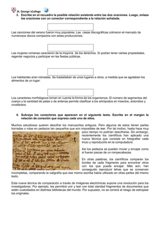 El documento presenta una tabla que describe diferentes tipos de conectores lógicos utilizados para articular ideas en un texto, incluyendo conectores de adición, contraste, causa, consecuencia, secuencia, ejemplificación, equivalencia, situación, evidencia y modo. Se proporcionan ejemplos de cada tipo de conector y ejercicios para practicar su uso.