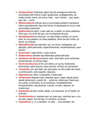 Los conectores lógicos permiten unir ideas en un texto de manera adecuada. Existen diferentes tipos como aditivos, opositivos, causativos, comparativos, reformulativos, ordenadores y condicionales. Sin conectores lógicos, un texto carece de sentido. Algunos ejemplos son "y", "pero", "por lo tanto", "igualmente", "por ejemplo", "en primer lugar" y "si".