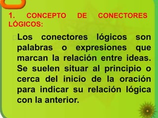 El documento describe diferentes tipos de conectores lógicos y su función. Los conectores lógicos son palabras o expresiones que indican la relación entre ideas. Existen conectores de causa, consecuencia, contraste u oposición, concesión, adición, equivalencia, orden y secuencia. Cada tipo de conector tiene una función específica como señalar motivos, deducciones, oposiciones o enumerar una serie de puntos. El documento finaliza proponiendo una actividad para crear una historia utilizando los diferentes conectores lógicos.