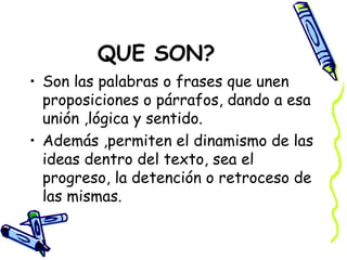 Este documento describe los conectores lógicos, que son palabras o frases que unen proposiciones y párrafos dentro de un texto para darle coherencia y sentido. Explica los diferentes tipos de conectores lógicos según la relación lógica que establecen, como causa, consecuencia, contraste, concesión, adición, y ofrece ejemplos. También define brevemente los tipos de resumen como resumen informativo, descriptivo y abstracto.