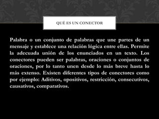 Este documento define los conectores textuales y describe varios tipos de conectores, incluyendo conectores aditivos, de contraste, disyuntivos, causales, condicionales, temporales, locativos, repetitivos, de precisión, comparativos, para resumir y concluir, y ordenativos. Los conectores son palabras o frases que unen partes de un texto y establecen relaciones lógicas entre ellas para mejorar la cohesión y coherencia del mensaje.