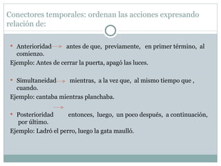 Este documento describe diferentes tipos de conectores y marcadores textuales que contribuyen a la cohesión de un texto. Explica conectores temporales que ordenan las acciones en relación al tiempo, como antes de que, mientras, luego. También describe conectores causales o de consecuencia que expresan relaciones de causa y efecto entre oraciones, como porque, por eso, por lo tanto. Además, menciona conectores que se usan para refutar como pero, sin embargo, no obstante.