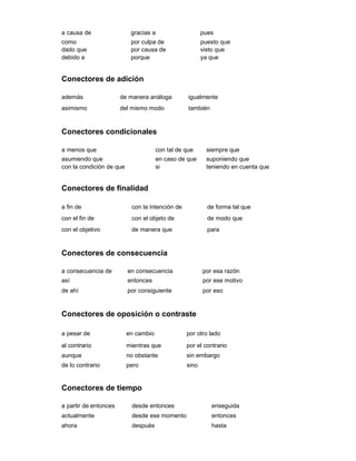 Este documento clasifica y define diferentes tipos de conectores, incluyendo conectores de comparación, orden, ejemplificación, causalidad, adición, condicionales, finalidad, consecuencia, oposición, tiempo, espacio, síntesis, conclusión y énfasis. Proporciona ejemplos de conectores específicos dentro de cada categoría para ilustrar sus usos y funciones.