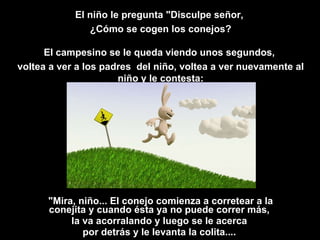 Un niño le pregunta a un vendedor de conejos cómo se "cogen" los conejos. El vendedor malinterpreta la pregunta del niño y comienza a explicar el acto sexual entre conejos. El padre interrumpe para aclarar que su hijo se refería a cómo se cazan los conejos. El vendedor responde diciendo que los conejos no son tontos y solo se aparean y no se casan.